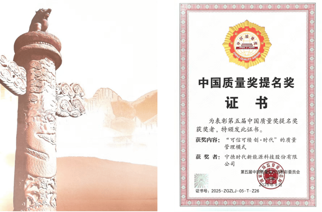 2025年9月16日,在中國質(zhì)量大會上,國家市場監(jiān)督管理總局正式頒發(fā)第五屆中國質(zhì)量獎,寧德時代憑借"可信可續(xù) 創(chuàng)·時代"質(zhì)量管理模式,榮獲中國質(zhì)量獎提名獎,成為歷年以來鋰電行業(yè)唯一獲獎企業(yè)。寧德時代質(zhì)量體系執(zhí)行總裁李偉出席并領獎。