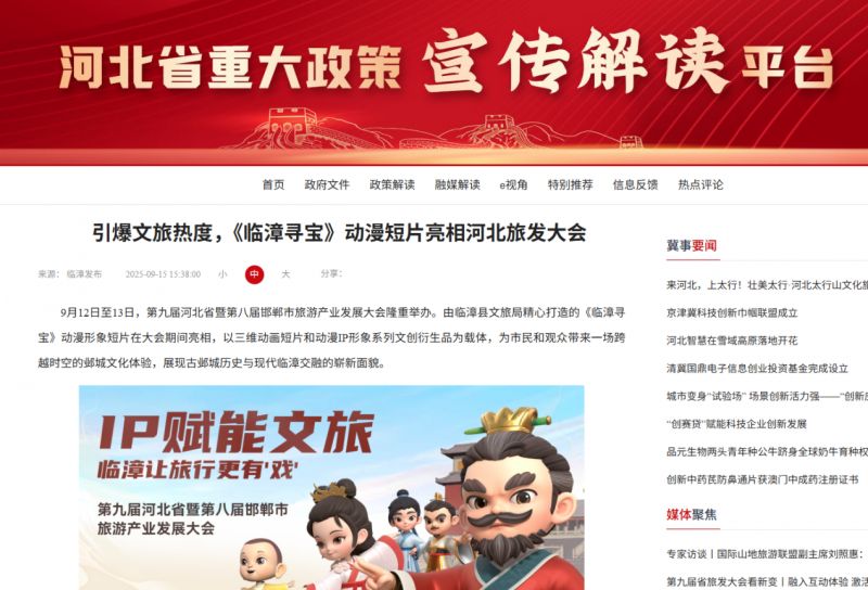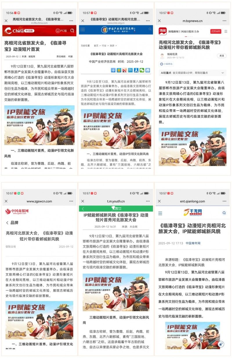 《臨漳尋寶》IP自發(fā)布以來,便以其獨特的歷史文化底蘊和創(chuàng)新的現(xiàn)代表現(xiàn)形式吸引了眾多關(guān)注。在本次旅游產(chǎn)業(yè)發(fā)展大會上,更是獲得了廣泛媒體支持。新華網(wǎng)、中國日報、中國網(wǎng)、環(huán)球時報、中國發(fā)展網(wǎng)、長城網(wǎng)、河青新聞網(wǎng)等數(shù)十家央級及河北省級權(quán)威媒體報道,同步在騰訊新聞、搜狐新聞、今日頭條、百度百家等主流新媒體平臺發(fā)布,覆蓋新聞門戶、視頻平臺、社交媒體等多維渠道,形成立體化傳播矩陣。