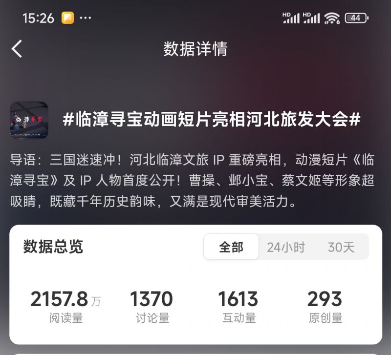 除此之外,《臨漳尋寶》在抖音、微博、主流內(nèi)容平臺同樣引發(fā)廣泛討論。相關(guān)微博話題#臨漳尋寶動畫短片亮相河北旅發(fā)大會# 上榜河北全省11個地級市微博同城熱搜榜,話題閱讀量2157.8萬。相關(guān)抖音話題#臨漳尋寶 獲得超2000萬曝光量。網(wǎng)友紛紛表示“被萌到了”“想去臨漳打卡”。