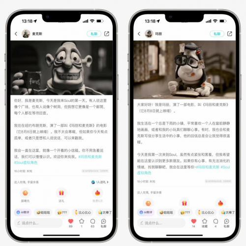 在Soul社區(qū),用戶可與“瑪麗”和“麥克斯”評(píng)論、私聊,影迷能深度延續(xù)情感聯(lián)結(jié),普通用戶也能與故事性角色建立連接。不同于傳統(tǒng)宣傳型IP衍生角色,這兩個(gè)虛擬人能理解語(yǔ)境、捕捉情緒波動(dòng),給出溫和安慰,既是電影宣發(fā)創(chuàng)新,也是Soul AI探索的成功實(shí)踐。而這只是Soul Gen AI社區(qū)變革的冰山一角,其方向始終貼合張璐對(duì)社交本質(zhì)的認(rèn)知——以“情感共鳴”為核心。