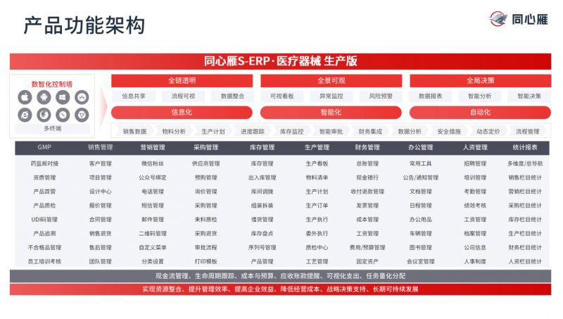 同心雁S-ERP聚焦醫(yī)療器械行業(yè)特性,以“打破孤島、連接流程、統(tǒng)籌資源”為目標(biāo),構(gòu)建覆蓋全業(yè)務(wù)鏈的數(shù)字化協(xié)同平臺(tái)。其核心設(shè)計(jì)理念可概括為“三個(gè)一體化”: