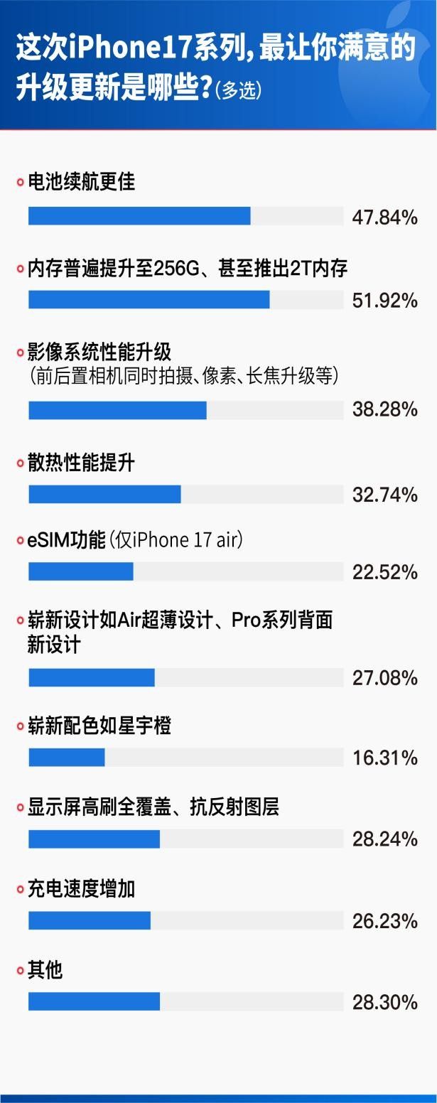 Pro機型與大存儲成為主流選擇,62.32%用戶選擇iPhone 17 Pro/Pro Max機型,其中35.42%首選Pro Max;存儲選擇上,512GB版本(44.25%)超越256GB(36.82%)成為最受歡迎選項,消費升級趨勢顯著。