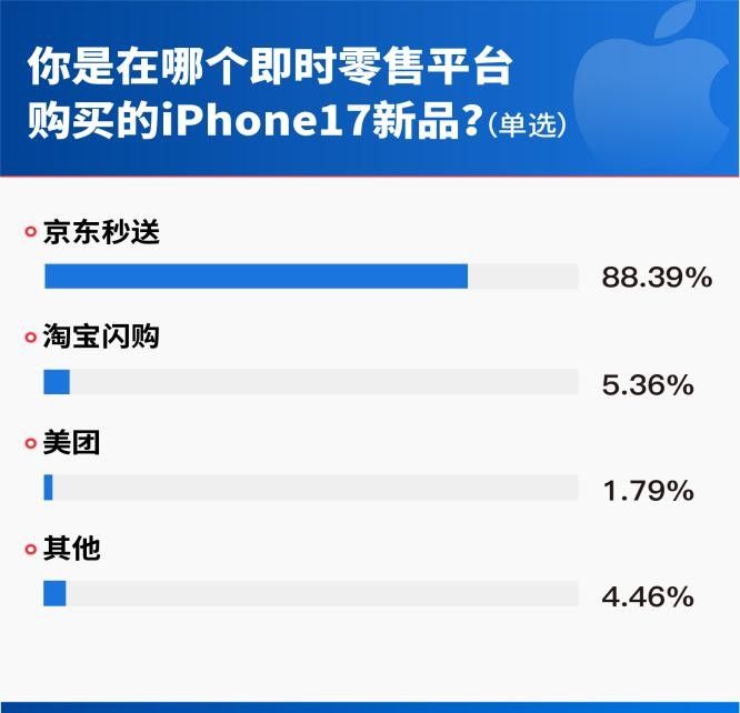 線上渠道主導市場,79.98%用戶通過線上購買iPhone 17系列,其中72.83%選擇了京東,與淘寶/天貓(9.28%)、Apple Store(6.24%)等平臺拉開較大差距;線下門店和即時零售購入新機的用戶則分別占比13.21%和6.82%;在即時零售領(lǐng)域,88.39%用戶首選京東秒送。