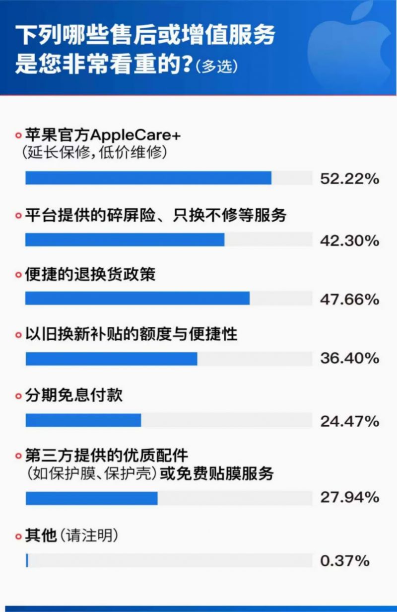 對于售價高昂的數(shù)碼產(chǎn)品而言,售前售中售后的全鏈路服務同樣關(guān)鍵。38.71%的用戶非??粗亍笆酆蟊U险咄晟啤保?7.66%的用戶認為“便捷的退換貨政策”很關(guān)鍵。我們注意到,京東將蘋果官方的AppleCare+、平臺提供的“只換不修”服務以及“以舊換新”(38.83%的用戶使用)整合為一站式體驗,消除用戶購機后顧之憂。