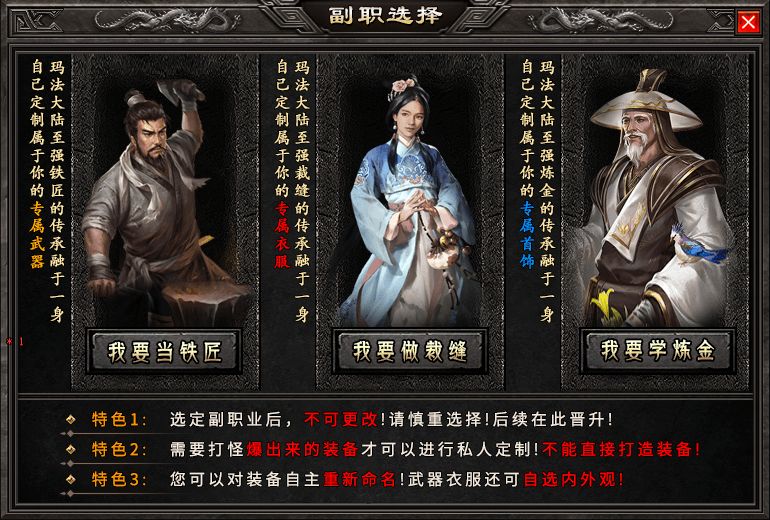 副職業(yè)是這個服的亮點所在,開局選擇一個副職業(yè),有三個,鐵匠、裁縫和煉金,用打怪爆出的裝備進(jìn)行私人定制,鐵匠可以定制專屬武器,裁縫可以定制專屬衣服,煉金可以定制專屬首飾。