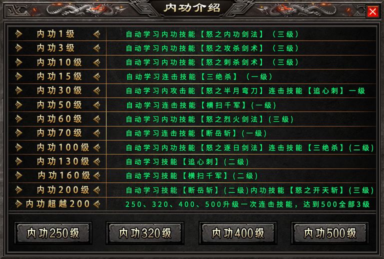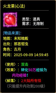 “火龍果(心法)”很中二的名字,卻很關(guān)鍵,內(nèi)功提升就靠它了。消耗經(jīng)驗值轉(zhuǎn)化為內(nèi)功經(jīng)驗,每顆火龍果都需要指定的經(jīng)驗數(shù),來轉(zhuǎn)化為對應(yīng)的內(nèi)功經(jīng)驗值。當(dāng)消耗經(jīng)驗值不足時,火龍果是無法使用的。