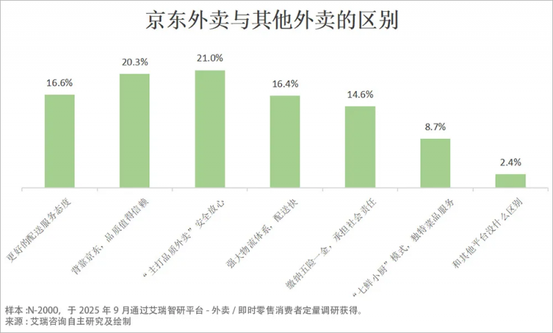 調(diào)研中,京東顯然具有明顯優(yōu)勢,提到京東外賣與其他外賣的區(qū)別,21%的用戶認為是“主打品質(zhì)外賣,安全放心”, 20.3%的用戶覺得“背靠京東電商平臺,品質(zhì)保障,值得信賴”,16.6%認為“有更好的配送服務態(tài)度”,這些用戶眼中的差異,已經(jīng)轉化為真實的選擇偏好,也意味著京東外賣以“信任”為核心的品質(zhì)化路線,不僅讓其在市場中站穩(wěn)了腳跟,也為行業(yè)樹立了“價值競爭”的標桿。