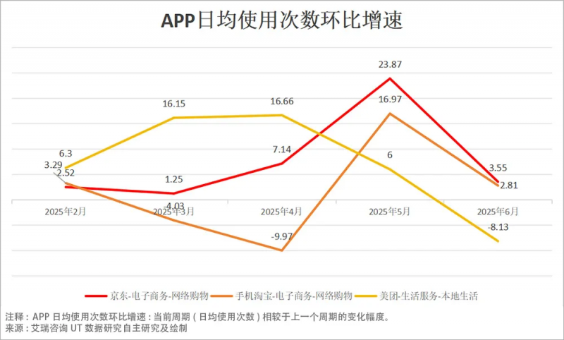 數(shù)據(jù)顯示,今年4月,美團APP日均使用次數(shù)環(huán)比增速為16.66%,處于領先位置,緊接著,關鍵轉變在5月份發(fā)生,京東以23.87%的高增速領跑全行業(yè),淘寶緊跟其后環(huán)比增長16.97%,而美團增速滑落至6%。結果顯而易見,2025年5月,外賣補貼帶動市場重新洗牌。