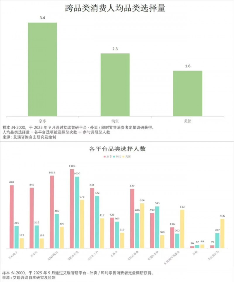 另外一組調(diào)研數(shù)據(jù)揭示了消費習慣重塑的本質(zhì),對比京東、淘寶與美團上進行跨品類消費傾向的行為,平均一位外賣消費者會留在平臺上選擇的其他商品種類分別為3.4個、2.4個和1.8個,京東和淘寶都以品類優(yōu)勢呈現(xiàn)出更強的承接優(yōu)勢。從數(shù)據(jù)來看,京東除了在3C、家電、數(shù)碼等傳統(tǒng)優(yōu)勢品類承托表現(xiàn)優(yōu)秀外,在超市百貨、個護、醫(yī)藥健康等品類上的承接也穩(wěn)穩(wěn)領先,這得益于平臺長期在品質(zhì)保障、品類豐富度、物流效率及售后服務上的積累。