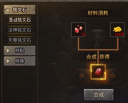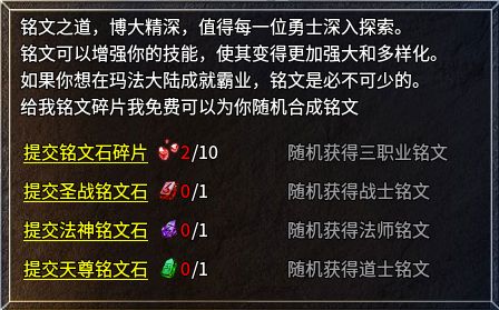 在角色欄可以看到,玩家可以裝配三個銘文,第一個銘文槽默認開啟,后兩個需要消耗金幣和對應(yīng)職業(yè)的銘文石才能解鎖。職業(yè)銘文石可以在精英怪和boss身上獲取,也可以直接用銘文石碎片在合成大師NPC處合成。