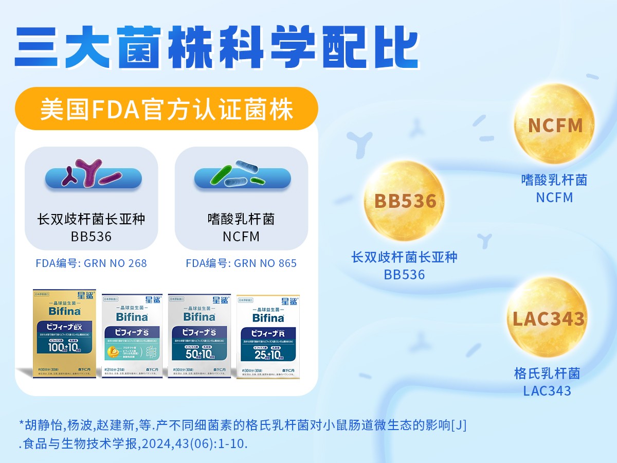 此外,森下仁丹Bifina?晶球益生菌在菌株的選擇上也十分考究,精選人體原籍菌-長(zhǎng)雙歧桿菌BB536,親和人體,安心可靠,研究歷史超50年,文獻(xiàn)研究近200篇[5],并獲美國(guó)FDA安全認(rèn)證及EFSA-QPS安全資格認(rèn)定[6]。配方中還添加嗜酸乳桿菌NCFM[7]與格氏乳桿菌LAC343[8],三大菌株科學(xué)配比,協(xié)同守護(hù)腸道微生態(tài)的穩(wěn)定。