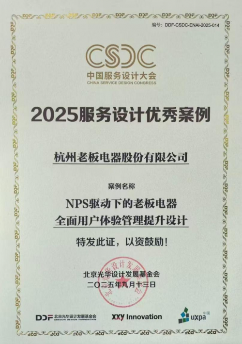 在近日由商務(wù)部服貿(mào)司主辦的第八屆中國服務(wù)設(shè)計(jì)大會上,老板電器憑借其獨(dú)具特色的“全面用戶體驗(yàn)管理暨NPS體系”榮獲優(yōu)秀案例獎,與科大訊飛、飛利浦等國際知名品牌同臺獲評。這一榮譽(yù)標(biāo)志著老板電器在用戶體驗(yàn)領(lǐng)域的創(chuàng)新實(shí)踐獲得國家層面的權(quán)威認(rèn)可,其“以用戶為中心”的服務(wù)理念已走在行業(yè)前列。