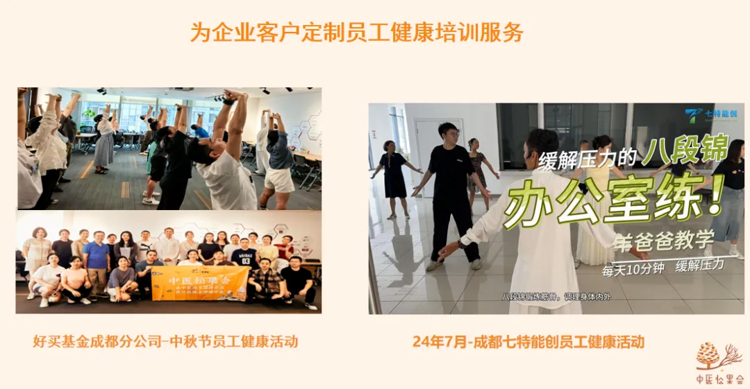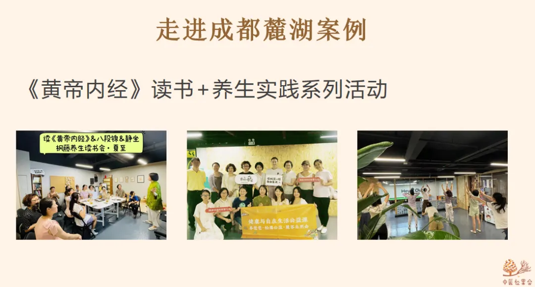 ?、诔扇私】叼B(yǎng)生類:通過健康養(yǎng)生實(shí)操營(讀書/養(yǎng)生實(shí)踐)、成人健康講座(中醫(yī)知識(shí)科普診、刮、艾、食療等專題)、功法課(靜坐/八段錦/五禽戲/站樁)等,全方面幫助成年人獲得健康養(yǎng)生方法。