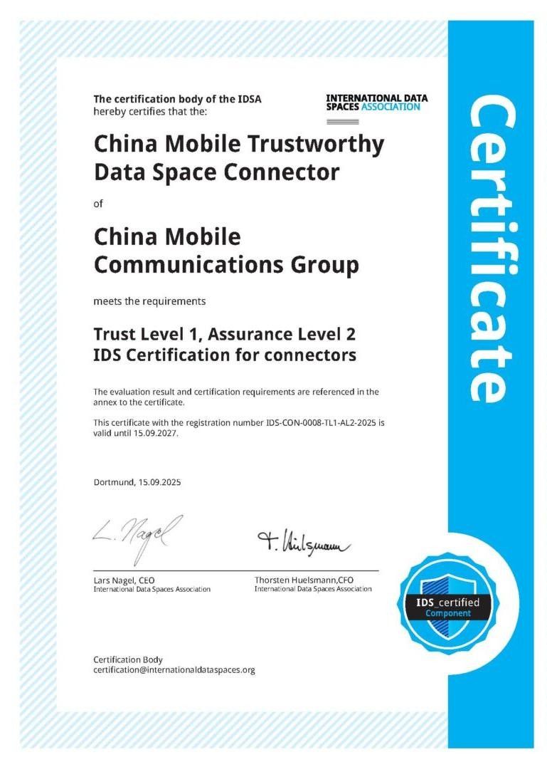 近日,中國移動(dòng)可信數(shù)據(jù)空間連接器在下一代互聯(lián)網(wǎng)國家工程中心-IDS數(shù)據(jù)空間測試認(rèn)證實(shí)驗(yàn)室順利通過評估,獲得了由國際數(shù)據(jù)空間協(xié)會(huì)(IDSA)頒發(fā)的國際數(shù)據(jù)空間(IDS)組件認(rèn)證。該成果標(biāo)志著產(chǎn)品在技術(shù)合規(guī)性、安全性與國際互操作性上符合了國際要求,實(shí)現(xiàn)了與國際數(shù)據(jù)空間標(biāo)準(zhǔn)的全面對齊,同時(shí)還為國內(nèi)數(shù)據(jù)空間生態(tài)的標(biāo)準(zhǔn)化建設(shè)提供了關(guān)鍵實(shí)踐標(biāo)桿。