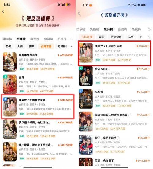 據(jù)紅果平臺“短劇熱播榜”(基于觀看量、互動量等綜合熱度排序)數(shù)據(jù)顯示,該劇當(dāng)前綜合熱度已突破5300萬,在熱播榜躋身榜單前三甲,在古風(fēng)言情品類中表現(xiàn)尤為亮眼,飆升排行榜第一。作為一部全新上線的作品,《柔弱世子妃鬧翻全京城》更收獲了37.9萬次收藏與71.3萬次點贊,觀眾互動熱情持續(xù)攀升。從熱評反饋來看,劇集的角色塑造備受認(rèn)可,“男主真的好好看、每次看到男主的劇都要感慨”等評論高頻出現(xiàn),足見演員與角色的適配度及觀眾認(rèn)可度。