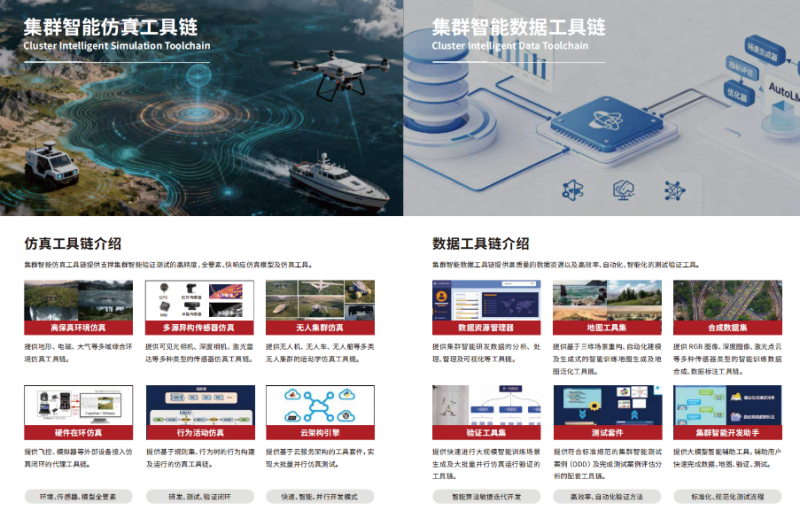 集群智能開發(fā)平臺作為前沿創(chuàng)新的核心引擎,依托仿真和數據兩大工具鏈,攻克行業(yè)標準缺失與驗證復雜性難題,為集群智能研發(fā)注入核心動力。其中,仿真工具鏈以模塊化、組件化的方式集成高保真仿真環(huán)境和高精度模型,提供強大的分布式并行計算與硬件在環(huán)能力;數據工具鏈提供豐富的地圖、合成數據、驗證工具 及測試套件。