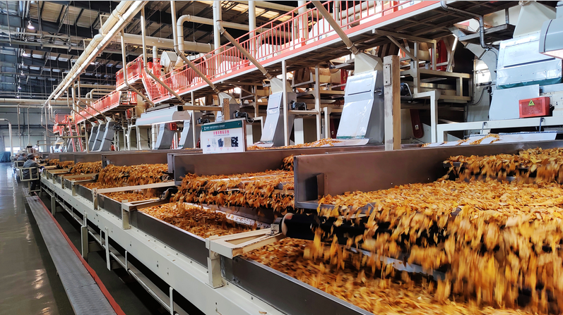 10月19日,天氣濕潤,在復烤車間,現(xiàn)代化的生產(chǎn)線全速運轉(zhuǎn)。煙葉經(jīng)過潤葉、打葉、去梗、復烤、冷卻、打包等多道工序,逐步完成從“原葉”到“復烤煙葉”的蛻變。復烤環(huán)節(jié)尤為關(guān)鍵——通過精準控制溫度、濕度與時間,既要去除多余水分,又要保留煙葉的香氣物質(zhì)與彈性。楚雄廠沉積了多年經(jīng)驗,結(jié)合科學合理的工藝參數(shù),確保每一批次煙葉的水分均勻、色澤一致、香氣純正。