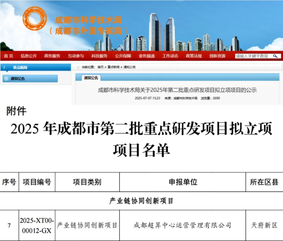 2025年7月,成都市科學技術局官網(wǎng)“關于2025年第二批重點研發(fā)項目擬立項項目的公示”,按照《成都市重點研發(fā)項目資助管理辦法》(成科字〔2022〕64號)相關規(guī)定,經(jīng)項目申報、評審、立項審議等程序,成都市科學技術局于2025年對22個技術創(chuàng)新研發(fā)項目(重點項目)、10個產(chǎn)業(yè)鏈協(xié)同創(chuàng)新項目進行立項資助。