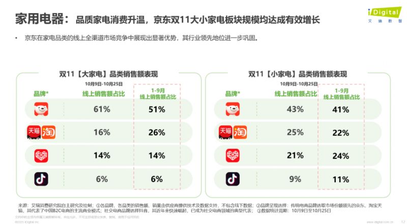 在平臺表現上,艾瑞報告顯示,京東在3C數碼與家電兩大核心品類的線上市場份額均位居第一,其中,3C數碼領域京東占比約60%,家電領域同樣穩(wěn)居全渠道首位。在3C數碼領域,智能手機、平板電腦、智能穿戴設備等主力品類保持高熱度,AI設備、運動相機、便攜電源等新興產品銷量同比顯著增長。而在家電領域,干衣機、中央空調等高端大家電與果蔬清洗機、凈水器等健康小家電同步增長。