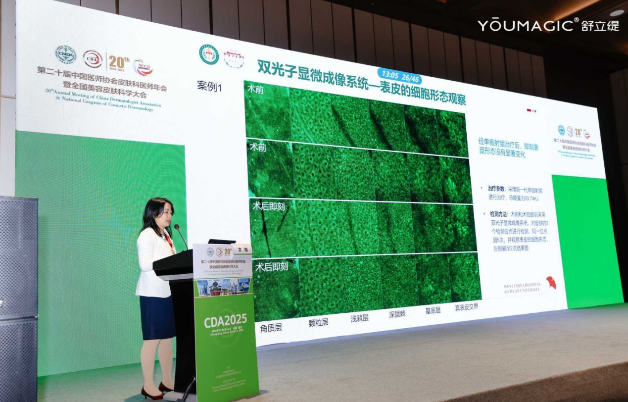 四川大學(xué)華西醫(yī)院皮膚科副主任文翔則聚焦療效評估體系革新,提出“客觀檢測+主觀評價”的科學(xué)范式。并分享了團隊的研究成果,表示舒立緹治療后,下頜提拉效果明顯,皮膚彈性顯著增加;治療1個月皮膚厚度提升約0.03厘米,且皮下脂肪層無明顯容積損失;且雙光子等檢測證實表皮、真皮層結(jié)構(gòu)無異常,為產(chǎn)品安全性與有效性提供了多維度實證,也為行業(yè)提供了可復(fù)制的評估標(biāo)準。