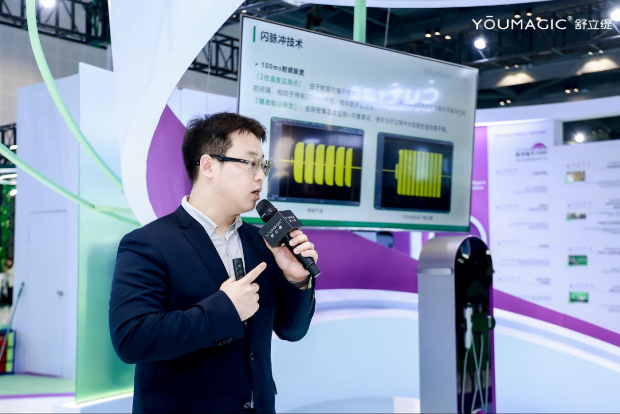 舒立緹以極具辨識度的科技風(fēng)展臺亮相會場,集中展現(xiàn)產(chǎn)品源自清華大學(xué)工程物理系的技術(shù)底蘊與嚴謹研發(fā)理念。展區(qū)通過精心設(shè)計的技術(shù)發(fā)展時間軸與臨床試驗數(shù)據(jù)墻,系統(tǒng)呈現(xiàn)了產(chǎn)品的技術(shù)源起,在皮膚醫(yī)療領(lǐng)域產(chǎn)業(yè)應(yīng)用探索,物理仿真實驗以及動物實驗、臨床驗證等細節(jié),展示完整研發(fā)歷程,強化“清華智造+醫(yī)工結(jié)合”的研發(fā)底色。