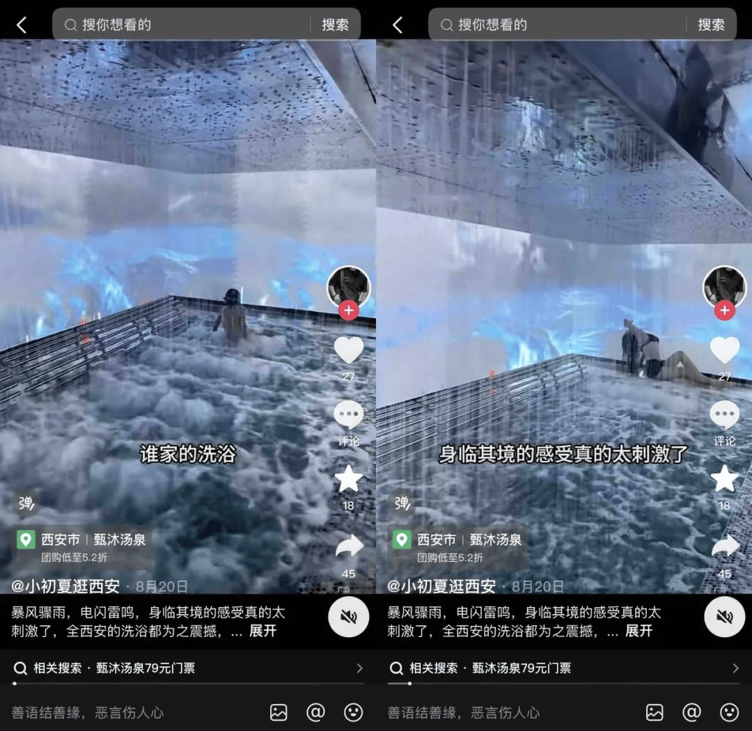 為了吸引消費(fèi)者,洗浴中心還開始了花式整活,比如西安甄沐湯泉,設(shè)置了“暴風(fēng)驟雨”打卡區(qū),客人們換上泳衣踏入淺水區(qū),在模擬的狂風(fēng)暴雨氛圍感中打卡出片。