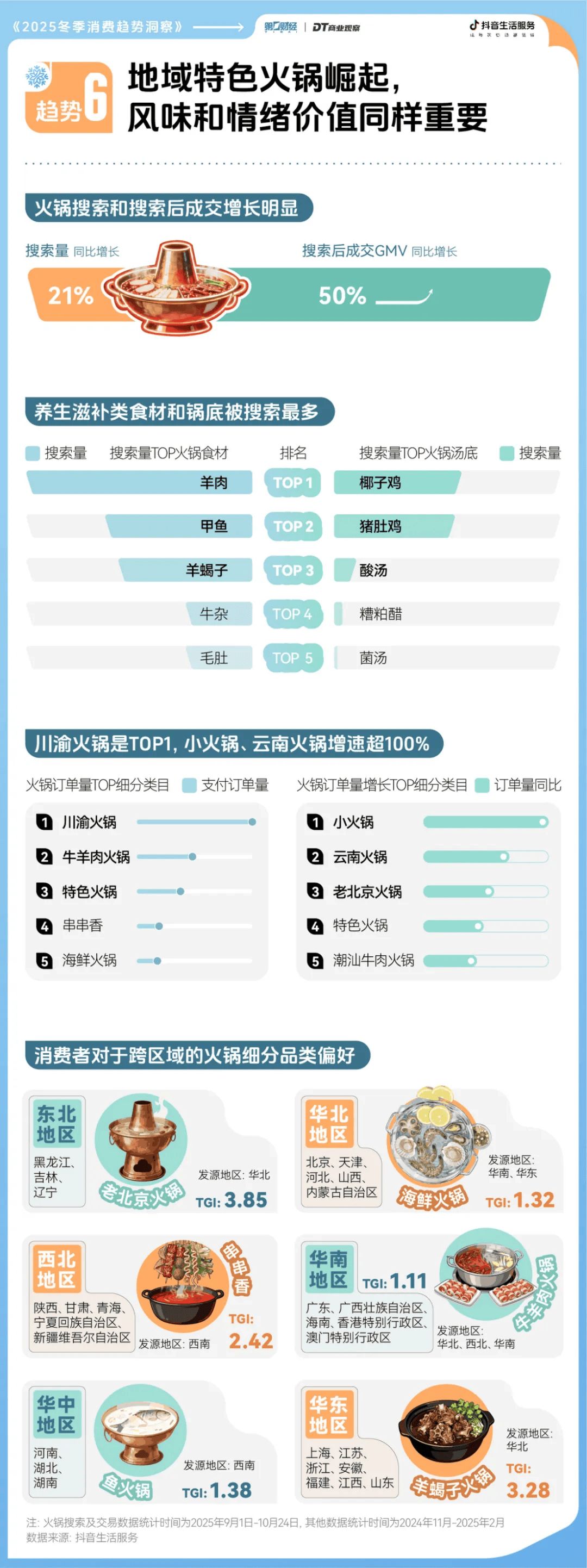 我們從今年的搜索和消費(fèi)數(shù)據(jù)中發(fā)現(xiàn),“冰雪游”、“休閑娛樂”和“美食”三個(gè)板塊熱度明顯提升,抖音生活服務(wù)聯(lián)合第一財(cái)經(jīng)|DT商業(yè)觀察,發(fā)布《2025冬季消費(fèi)趨勢洞察》,從去年冬季的經(jīng)營數(shù)據(jù)中挖掘趨勢和亮點(diǎn),為今年冬季的商家經(jīng)營提供一些前瞻參考。