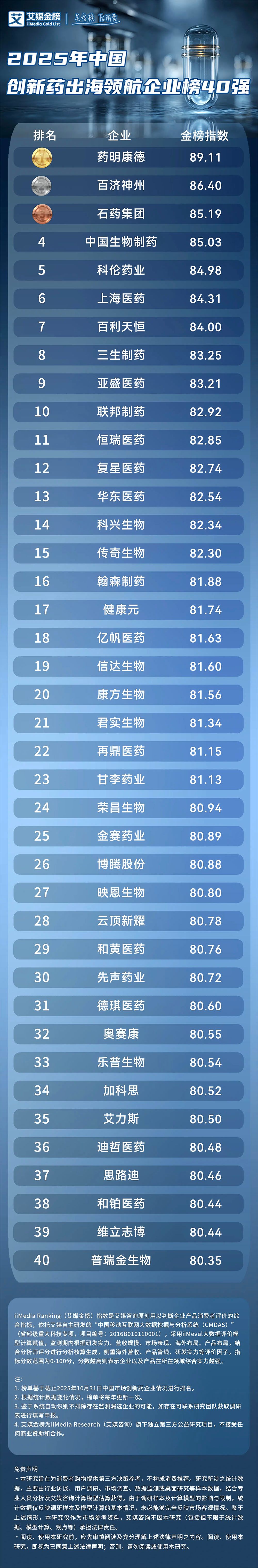 iiMedia Ranking(艾媒金榜)是艾媒咨詢旗下中國(guó)新消費(fèi)品牌評(píng)價(jià)機(jī)構(gòu),為消費(fèi)者提供客觀的品牌信息及購物消費(fèi)指南。iiMedia Ranking(艾媒金榜)最新發(fā)布《2025年中國(guó)創(chuàng)新藥出海領(lǐng)航企業(yè)榜40強(qiáng)》,金榜指數(shù)是艾媒咨詢?cè)瓌?chuàng)用以判斷企業(yè)產(chǎn)品消費(fèi)者評(píng)價(jià)的綜合指標(biāo),依托艾媒自主研發(fā)的“中國(guó)移動(dòng)互聯(lián)網(wǎng)大數(shù)據(jù)挖掘與分析系統(tǒng)(CMDAS)”(省部級(jí)重大科技專項(xiàng),項(xiàng)目編號(hào):2016B010110001),采用iiMeval大數(shù)據(jù)評(píng)價(jià)模型計(jì)算賦值,監(jiān)測(cè)期內(nèi)根據(jù)研發(fā)實(shí)力、營(yíng)收規(guī)模、市場(chǎng)表現(xiàn)、海外布局、產(chǎn)品布局,結(jié)合分析師評(píng)分進(jìn)行分析核算生成,側(cè)重海外營(yíng)收、產(chǎn)品管線、研發(fā)實(shí)力等評(píng)價(jià)因子。指標(biāo)分?jǐn)?shù)范圍為0-100分,分?jǐn)?shù)越高則表示企業(yè)以及產(chǎn)品在所在領(lǐng)域綜合實(shí)力越強(qiáng)。