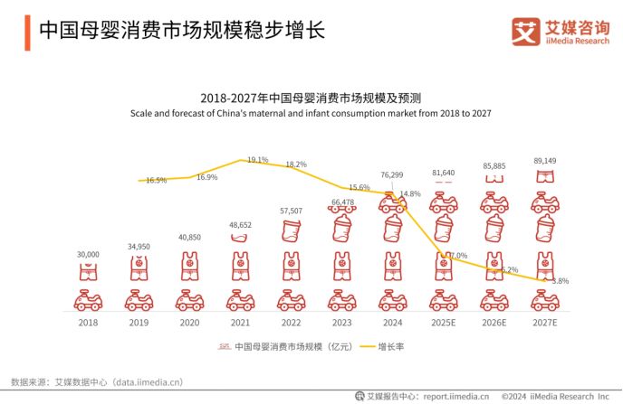 近年來(lái),中國(guó)母嬰市場(chǎng)歷經(jīng)多重變革:經(jīng)濟(jì)波動(dòng)影響人們的消費(fèi)能力,精細(xì)化喂養(yǎng)趨勢(shì)重塑市場(chǎng)需求結(jié)構(gòu),95后、00后新生代父母逐漸成為消費(fèi)主力,推動(dòng)代際觀念變遷,新國(guó)標(biāo)落地更直接抬高行業(yè)門(mén)檻。iiMedia Research(艾媒咨詢)數(shù)據(jù)顯示,2024年中國(guó)母嬰消費(fèi)市場(chǎng)規(guī)模達(dá)76299億元,預(yù)計(jì)2027年將增至89149億元,市場(chǎng)潛力持續(xù)釋放。