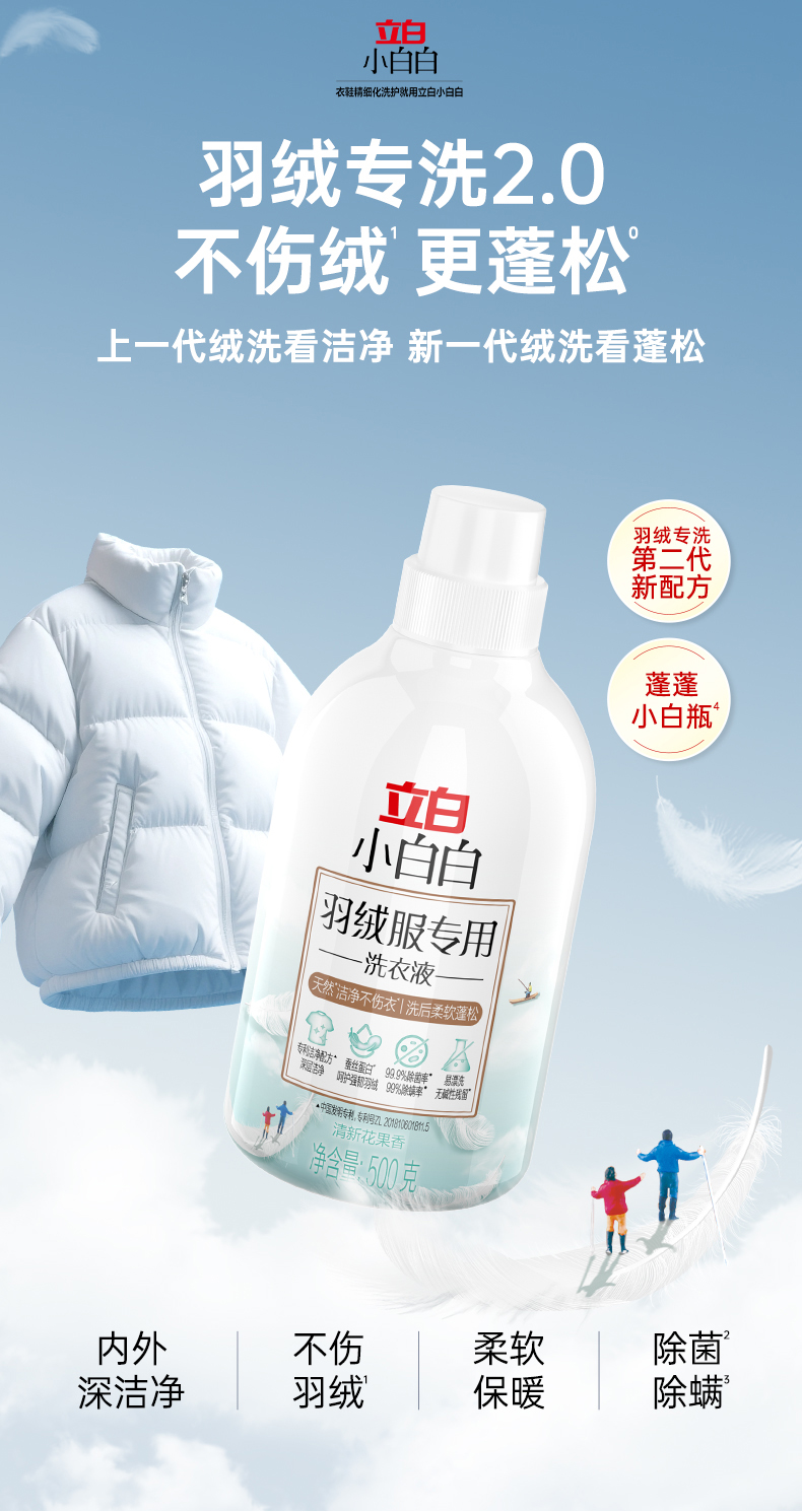 如果說立白小白白羽絨服專用洗衣液1.0版本是品牌在羽絨洗護(hù)市場的“破局之作”,那么2025年10月全新升級的2.0版本,則標(biāo)志著品牌從“市場需求響應(yīng)者”向“羽絨專業(yè)洗護(hù)先行者”的戰(zhàn)略跨越。引領(lǐng)消費(fèi)者的集體意識從基礎(chǔ)的“洗凈”跨越到高階的“養(yǎng)絨”,同時(shí)也印證了 “蓬松度”已成為衡量羽絨洗護(hù)效果的新黃金標(biāo)準(zhǔn)。立白小白白也以先行者的身份,引領(lǐng)行業(yè)全面進(jìn)入羽絨專洗2.0的新時(shí)代。