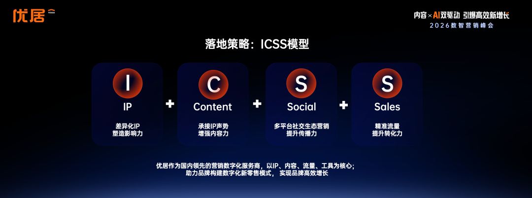 為助力企業(yè)落地「心價(jià)比」?fàn)I銷(xiāo),蔡鉞分享了優(yōu)居沉淀多年的高效營(yíng)銷(xiāo)方法論ICSS——I(IP):打造差異化IP,塑造品牌勢(shì)能;C(內(nèi)容):承接IP熱度,強(qiáng)化內(nèi)容生產(chǎn);S(社媒):多平臺(tái)聯(lián)動(dòng),擴(kuò)大傳播聲量;S(轉(zhuǎn)化):精準(zhǔn)流量運(yùn)營(yíng),提升轉(zhuǎn)化效率。