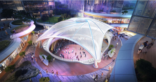 ? 「活力廣場(chǎng)」采用旋渦動(dòng)感造型的膜結(jié)構(gòu),外圈由流線型異形金屬檐口包圍,中央區(qū)域創(chuàng)新性地運(yùn)用ETFE氣枕膜構(gòu)成的雙層膜結(jié)構(gòu),并配備智能充氣系統(tǒng)。ETFE膜材透光卻不壓抑,盡管加工與安裝工藝復(fù)雜,卻極大地賦予了空間動(dòng)態(tài)活力與輕盈質(zhì)感。