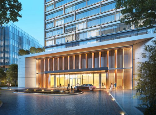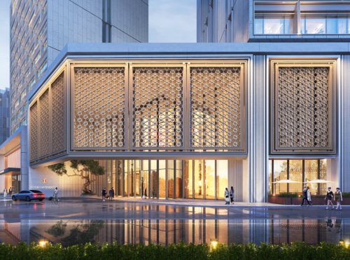 ? 裙樓立面采用不規(guī)則錯(cuò)層的全明玻璃幕墻,飾以金屬色澤的氟碳噴涂鋁板,塑造出“步步登高”的現(xiàn)代建筑韻律。入口處則選用啞光石材、金屬格柵與仿木紋鋁合金,以古樸的精致細(xì)節(jié)與之呼應(yīng),展現(xiàn)出鮮明的古今交融特色。