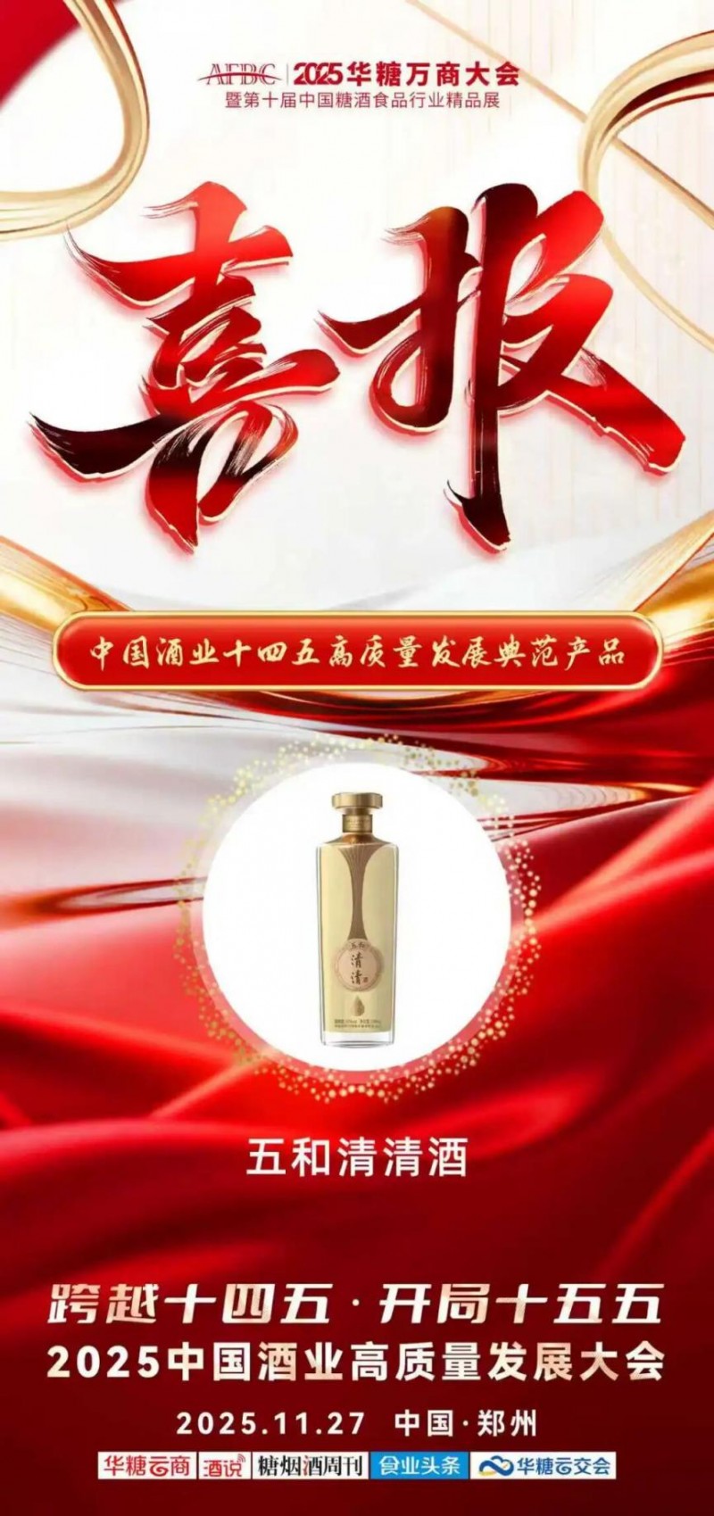11月27日上午,“跨越十四五·開局十五五”——2025中國酒業(yè)高質量發(fā)展大會,聚焦酒業(yè)在產業(yè)周期中的破局增長,總結酒業(yè)十四五成就、擘畫十五五藍圖,為行業(yè)厘清發(fā)展脈絡,共啟中國酒業(yè)新未來。中國糖酒食品經銷商進化大會暨“十四五”優(yōu)秀經銷商表彰盛典活動中,五和清清酒榮膺“中國酒業(yè)十四五高質量發(fā)展典范產品”稱號。