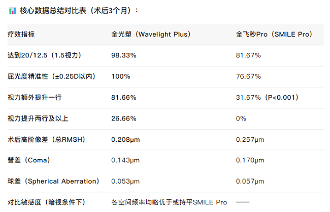 尤為引人注目的是,在視力額外提升方面,81.66%的全光塑患者術后視力比術前最佳矯正視力至少提升了一行,全飛秒Pro組這一比例僅為31.67%,統(tǒng)計學差異極其顯著(P<0.001)。此外,全光塑組在術后高階像差(總RMSH、彗差、球差)的數(shù)值上均低于對照組,意味著其在減少夜間眩光、光暈,提升視覺質(zhì)量方面潛力更大。對比敏感度測試在暗視條件下,全光塑也略優(yōu)于或持平于全飛秒Pro。