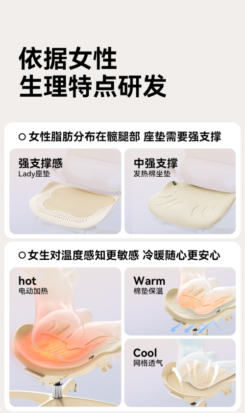 這是人體工學(xué)第一次把“溫感科學(xué)”納入久坐健康系統(tǒng),是西昊對(duì)女性的真正關(guān)懷。