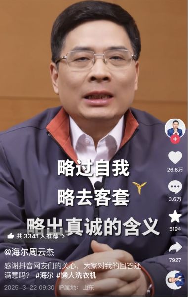 “聽勸總裁”——這個網(wǎng)友自發(fā)賦予周云杰的標(biāo)簽,已經(jīng)成為其最具辨識度的符號。在接受新華社采訪時,周云杰認(rèn)為這一標(biāo)簽本質(zhì)上是網(wǎng)友對海爾尊重用戶的一種認(rèn)可。