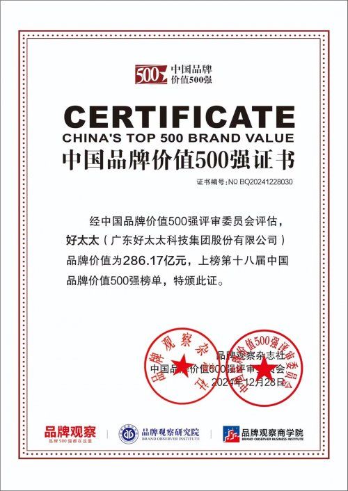 近日,中國品牌價值評價結(jié)果正式揭曉,廣東好太太科技集團股份有限公司(股票代碼:603848)憑借強勁的綜合實力與深遠的行業(yè)影響力,連續(xù)十年榮登“中國品牌價值500強”榜單,品牌價值高達286.17億元,再度印證其在智能家居領(lǐng)域的領(lǐng)軍地位。從1999年開創(chuàng)晾曬新品類,到如今成為覆蓋全屋智能場景的行業(yè)標桿,好太太以“客戶為本,持續(xù)創(chuàng)新,共創(chuàng)共享”為核心價值觀,書寫了中國智能家居企業(yè)的成長傳奇。