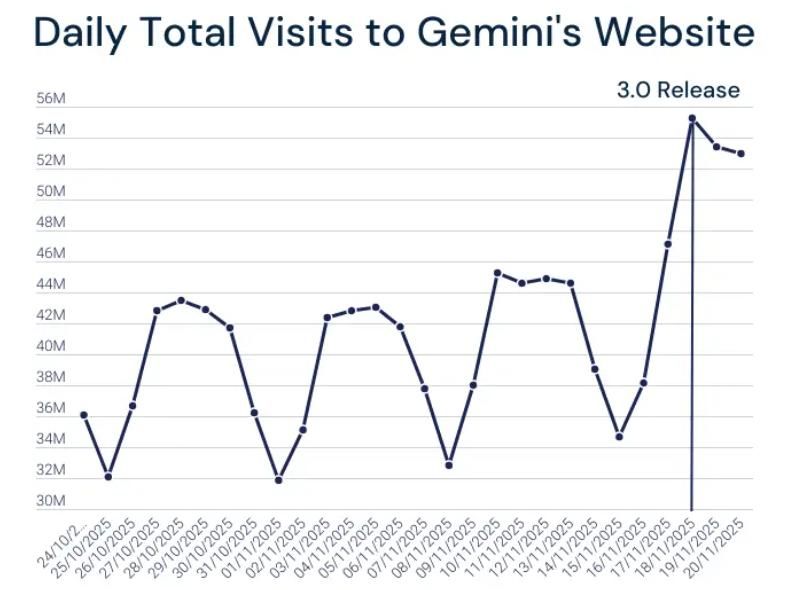 事實(shí)上,自谷歌(GOOG.US)Gemini 3 的發(fā)布徹底打破了AI 平衡。上線當(dāng)日,全球訪問(wèn)量便突破 5400 萬(wàn)次,創(chuàng)平臺(tái)歷史新高。面對(duì) Google 這一次王者歸來(lái),壓力傳導(dǎo)到了競(jìng)爭(zhēng)對(duì)手OpenAI 。