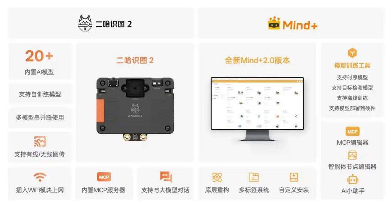 蘑菇云此次獲獎(jiǎng)的核心支撐,是其全新升級的“二哈識圖2”AI視覺傳感器與深度重構(gòu)的“Mind+ 2.0”圖形化編程軟件。這一軟硬件結(jié)合的創(chuàng)新解決方案,旨在將復(fù)雜的人工智能技術(shù)轉(zhuǎn)化為中小學(xué)師生可輕松上手、深度實(shí)踐的教學(xué)工具。