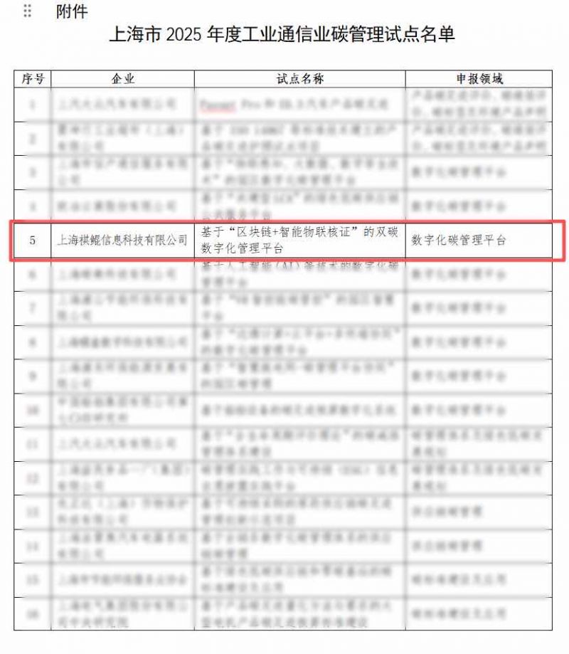 12月10日,上海市經(jīng)濟和信息化委員會正式公布《2025年度上海市工業(yè)通信業(yè)碳管理試點名單》。上海祺鯤信息科技有限公司憑借「基于“區(qū)塊鏈+智能物聯(lián)核證”的雙碳數(shù)字化管理平臺」成功入選數(shù)字化碳管理平臺試點項目,成為上海市首批碳管理試點示范企業(yè)之一。