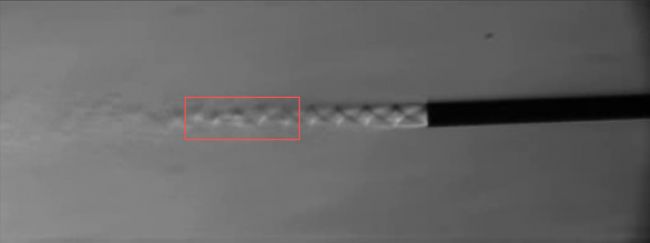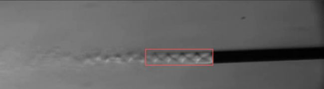 高速影像記錄顯示在直管噴口附近,超音速氣流經(jīng)過膨脹與壓縮交替過程后,在噴射初段(約12 mm)呈現(xiàn)輪廓清晰的周期性環(huán)狀激波,4個穩(wěn)定的馬赫環(huán)排列整齊,軸對稱度高,邊界銳利,明暗對比明顯,是紋影法中典型的密度梯度圖像。這說明噴射前段處于典型的重復膨脹-壓縮循環(huán)模式:噴口靜壓高于環(huán)境壓力,氣體離開噴口立即發(fā)生膨脹,氣流加速,密度下降,膨脹后的超聲速氣體在外界壓力作用下被重新壓縮,形成環(huán)狀壓縮激波即馬赫環(huán),膨脹-壓縮過程周期性出現(xiàn),形成前段的激波串結(jié)構(gòu)。