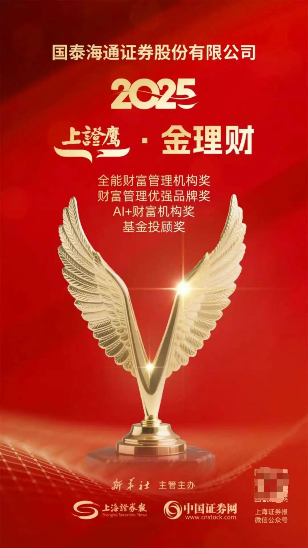 12月12日,由上海證券報主辦的2025“上證鷹·金理財財富管理評選”結(jié)果正式揭曉,國泰海通憑借在財富管理領(lǐng)域的卓越表現(xiàn)與創(chuàng)新實踐,榮膺“全能財富管理機構(gòu)獎”“財富管理優(yōu)強品牌獎”“AI+財富機構(gòu)獎”“基金投顧獎”四項大獎。