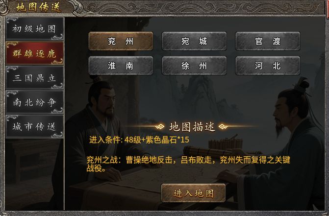 地圖探索遵循著精妙的遞進設計:圖一只有紫名精英怪,圖二就會出現(xiàn)橙名BOSS,只有擊敗圖二的BOSS,才能開啟圖三的傳送點,見到最終的紅色BOSS。例如在兗州地圖,你必須先擊敗夏侯惇,才能進入圖三挑戰(zhàn)最終BOSS陳宮。這種層層遞進的探索感,讓每一次地圖攻略都像是一場精心策劃的軍事行動。