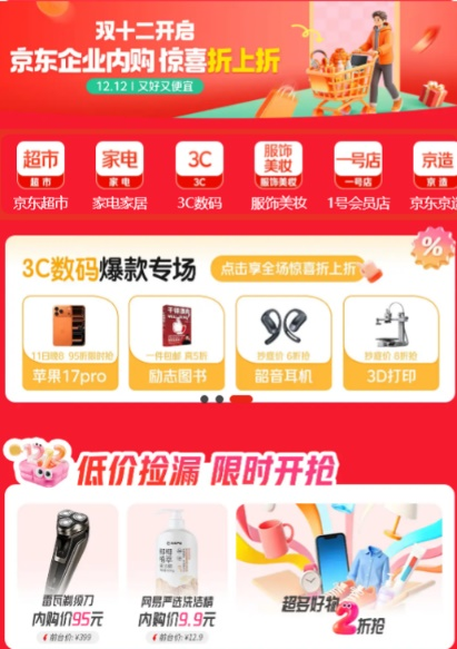 近日,京東政企業(yè)務(wù)正式上線“企業(yè)內(nèi)購12.12”活動(dòng),面向合作企業(yè)員工開啟專屬內(nèi)購?fù)ǖ?,以“?yōu)商優(yōu)品、優(yōu)質(zhì)優(yōu)價(jià)”的雙重保障,為企業(yè)客戶打造一站式、高效率的年末采購解決方案。員工可通過企業(yè)認(rèn)證,在京東錦禮小程序等指定平臺(tái)參與專場(chǎng)活動(dòng),享受“驚喜折上折”與精選爆品雙重優(yōu)惠。