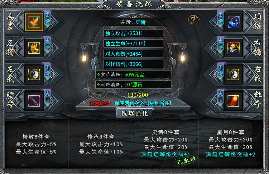 在裝備洗練系統(tǒng)中,除劍甲以外的八件裝備可進(jìn)行洗練,經(jīng)過洗練的裝備可從獨(dú)立攻擊、獨(dú)立生命、對(duì)人真?zhèn)?、?duì)怪切割獲取加成,每次洗練都會(huì)消耗元寶和源石,洗練品階由低到高可分為精致、傳承、史詩、星月,每洗練200次必出一個(gè)最高級(jí)的星月屬性,洗練湊齊八件套即可解鎖洗練品階的套裝效果,如果出現(xiàn)全部八件裝備全部洗練后品階不一致,觸發(fā)的套裝效果將以身上最低品質(zhì)的套裝效果為準(zhǔn),登峰造極、大滿足大驚喜完全不是夢(mèng)。
