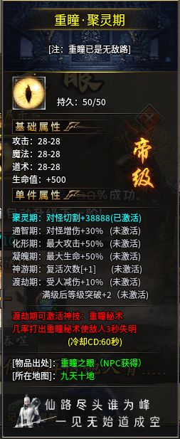 比如重瞳之眼,是進(jìn)入四大陸后的一個(gè)重要裝備,別看它的基礎(chǔ)屬性一般,但它升級(jí)后將帶來大量的屬性加成,到神游期后更是直接給玩家的復(fù)活次數(shù)直接加一,一些原本差一點(diǎn)就可以打過的怪在激活這個(gè)屬性后即可輕松解決。