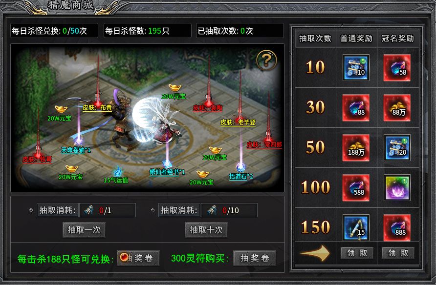獵魔商城是游戲中一個(gè)刷怪抽獎(jiǎng)的玩法,每擊殺188只怪可以獲得一個(gè)抽獎(jiǎng)券,抽獎(jiǎng)券可以用來抽取皮膚、天命卷軸等材料和貨幣。抽取次數(shù)還能領(lǐng)取獎(jiǎng)勵(lì),冠名獎(jiǎng)勵(lì)會(huì)更豐厚,有不少加屬性的酷炫足跡!這個(gè)抽獎(jiǎng)次數(shù)不會(huì)清零,會(huì)一直累加,給足了誠意福利等待玩家不斷探索。