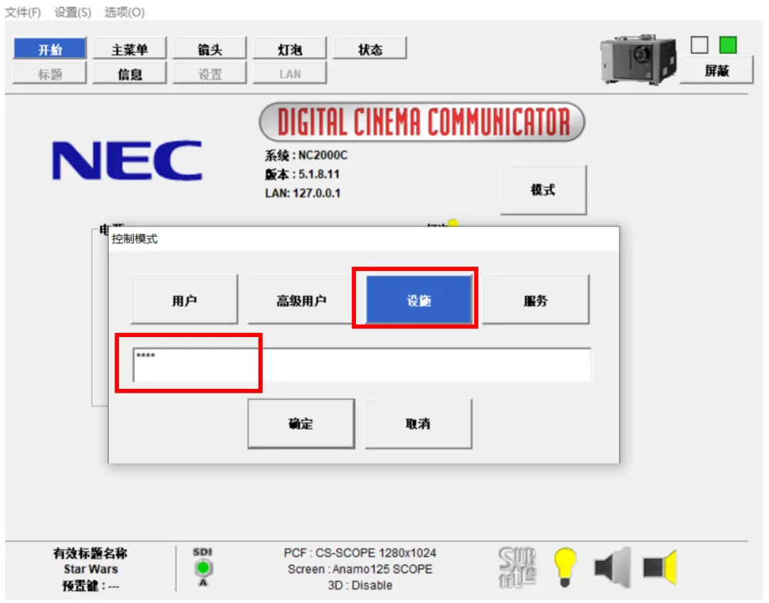 1、打開(kāi)DCC軟件,輸入IP地址,與需要調(diào)試的放映機(jī)連通后,獲取放映機(jī)的安裝調(diào)試權(quán)限,點(diǎn)擊以下按鈕,在彈出的界面內(nèi)選擇設(shè)置,輸入密碼1111,點(diǎn)擊確定。