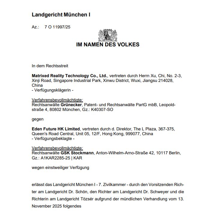 據(jù)了解,案件始于2025年9月22日。XREAL 針對 Viture Inc. 及其香港運(yùn)營實體 Eden Future HK Limited 向德國法院遞交臨時禁令請求,所涉專利聚焦增強(qiáng)現(xiàn)實設(shè)備及其光學(xué)系統(tǒng)這一核心技術(shù)領(lǐng)域。值得注意的是,Viture Inc.在初期并未應(yīng)訴,直至9月29日法院已單方面批準(zhǔn)針對其的禁令后,才于11月7日提交應(yīng)訴文件,并要求參與11月13日的正式庭審。德國法院經(jīng)審理后,正式認(rèn)定侵權(quán)事實成立,強(qiáng)化了禁令的法律效力。